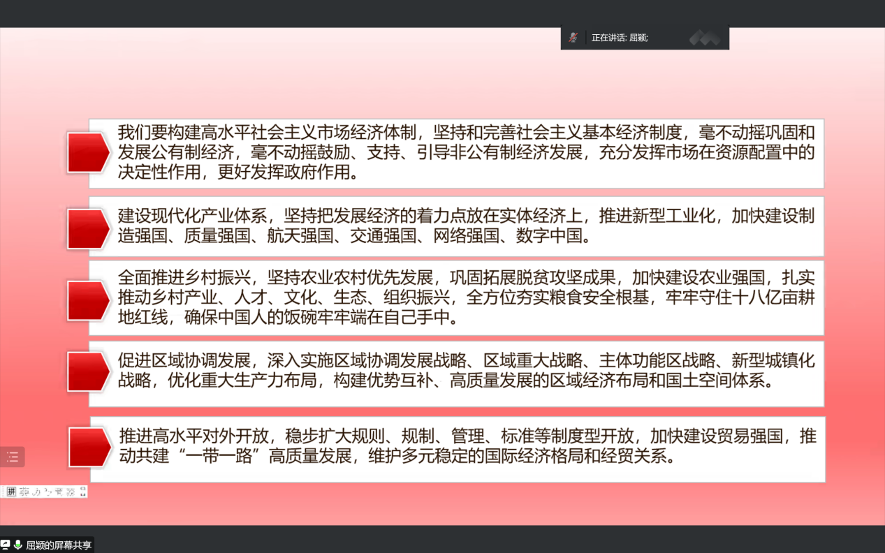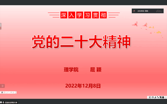 屈颖结合党的二十大报告讲解了党的过去五年工作和新时代十年的伟大变革,我们党团结带领人民,推动党和国家事业取得了举世瞩目的重大成就。她分十二个主要方面带领大家学习了党的二十大报告,对全体同学提出了期望,希望各位同学坚定不移听党话、跟党走,怀抱梦想又脚踏实地,立志做有理想、敢担当、能吃苦、肯奋斗的新时代好青年。