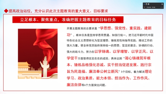 闫永刚从“提高政治站位,充分认识此次主题教育的重大意义、目标要求”“重温习近平总书记对教育和人才的重要论述”“以‘一融双高’为抓手,推动学院事业和党的建设高质量发展”三方面进行了讲解。对学院教师人才队伍进行了分析,强调要全方位引育人才、营造识才爱才敬才用才环境。指出,“学”是主题教育的前提和基础,关键在“思”,目的在“用”。全院上下要学深悟透习近平新时代中国特色社会主义思想,坚持好、运用好贯穿其中的立场观点方法,做到学思用贯通、知信行统一,把党的创新理论贯彻落实到推动学院各项工作的各方面全过程,把主题教育焕发出来的学习、工作热情转化为攻坚克难、干事创业的强大动力。