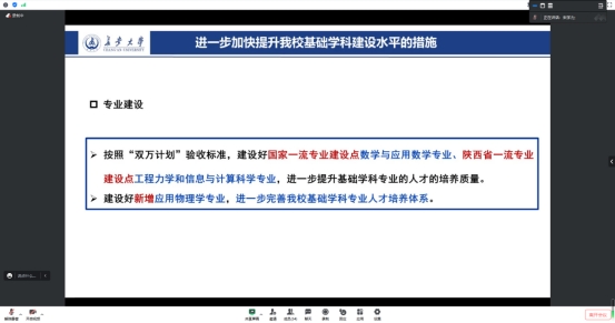 宋学力从参加主题教育的学习情况引入,与大家一起分享了学习的认识和感悟,重点从“完善基础学科专业体系”“进一步加强党的建设,为高水平基础学科建设提供坚强的政治保障和思想引领”“创新人才培养模式,优化本硕博贯通培养体系,进一步提升基础学科人才培养质量”“加强师资队伍建设”“进行有组织的教学研究,不断提升基础学科教师的教学研究能力”“加大基础理论及其交叉应用研究的组织力度,进一步提高原始创新能力和服务社会的能力”“加强基础理论研究平台和交叉学科科研平台建设,为基础学科建设提供高水平平台支撑”“加强与国际知名高校的交流与合作,进一步提升国际合作与交流能力”等八个方面提出了进一步加快提升williamhill官网基础学科建设水平的内容和措施。最后指出,希望全院师生能够以学习贯彻习近平新时代中国特色社会主义思想主题教育为契机,紧紧围绕主题教育的目标要求,以学铸魂、以学增智、以学正风、以学促干,把学习与履行工作职责结合起来,与学院年度党政工作要点结合起来,与推进绩效考核、博士点申报等各项重点任务结合起来,坚持学思用贯通、知信行统一,把习近平新时代中国特色社会主义思想转化为坚定理想、锤炼党性和指导实践、推动工作的强大力量,以高水平学科建设引领学院高质量发展,为早日实现把学院建设成“教学成果突出、专业和学科建设水平较高、在行业高校中有一定影响力的williamhill体育在线登录”的奋斗目标不懈努力。