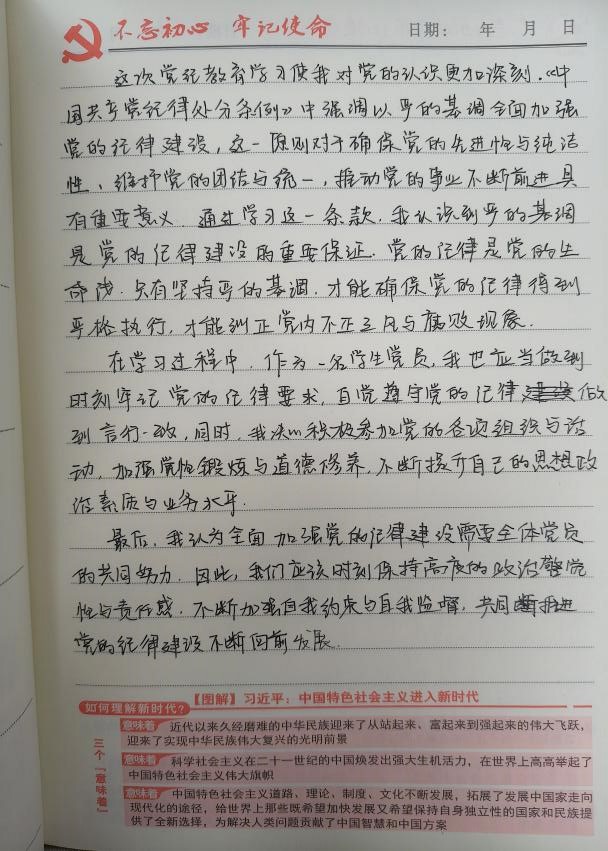 史天祯发表感想:作为一名学生党员,我应当做到时刻牢记党的纪律要求,自觉遵守党的纪律,做到言行一致。