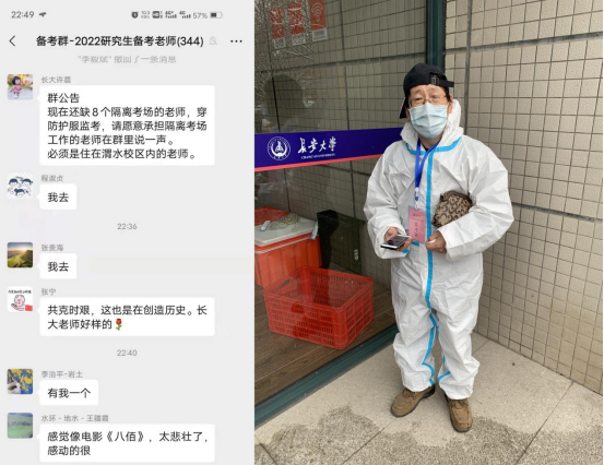 突如其来的疫情,打乱了原有的考研安排。根据学校号召,学院教工及家属主动报名参与研究生考试期间考务、监考、保障服务工作。根据“应考尽考”的工作目标,学校设置了隔离考场。学院张贵海、段承博老师主动承担了隔离考场的监考任务。张贵海老师前期患脑出血,目前仍在康复期,当“研究生备考群”中发出“还缺8个隔离考场的老师”时,张贵海仍第一时间回复“我去”,主动申请去隔离考场监考。看似简单的两个字,背后是一个老教师对岗位沉甸甸的责任,更是对学校、对学生、对岗位深深的爱。由于是隔离考场,按疫情防控要求,结束监考后,张贵海、段承博老师要就地隔离14天。